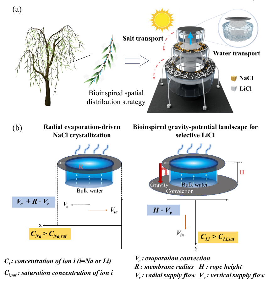 图1. 柳树仿生空间分离结晶系统。(a) Li+/Na+空间分离与提锂系统设计。(b) LiCl/NaCl分层同步结晶机理示意图。