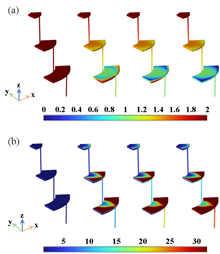 图3. 蒸发器内离子分布演化的COMSOL数值模拟:(a) Na+; (b) Li+。