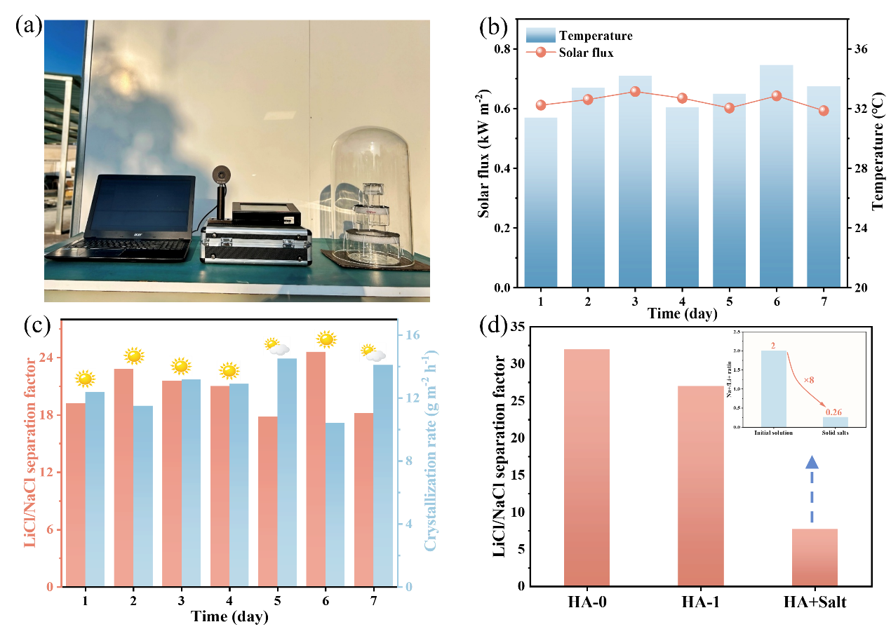 图4. (a) 2025年6月11日于重庆大学开展的户外实验现场照片。(b) 户外条件下的太阳辐照度与温度变化及(c) 空间分离结晶装置在连续7天实验中的LiCl/NaCl分离因子与盐结晶速率。(d) 不同溶液体系下的LiCl/NaCl分离因子。