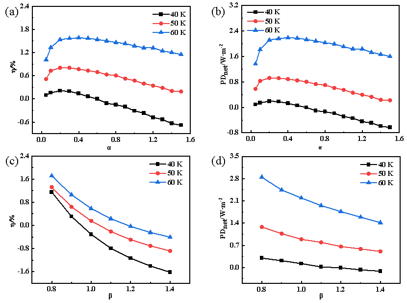 (2)冷热端之间存在最佳流量比以实现系统性能与经济性的最优平衡。随着膜面积比的增加,能量转换效率与输出功率均呈现下降趋势。