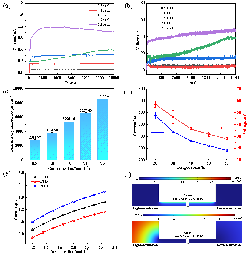 图2. 盐度梯度发电。(a)电流和(b)电压随运行时间的变化。(c)不同浓度下低浓度侧电导率的变化。(d)NRED两侧不同温度下的电流和电压。(e)NRED中不同温度梯度的模拟。(f)纳米通道中的浓度分布云图。