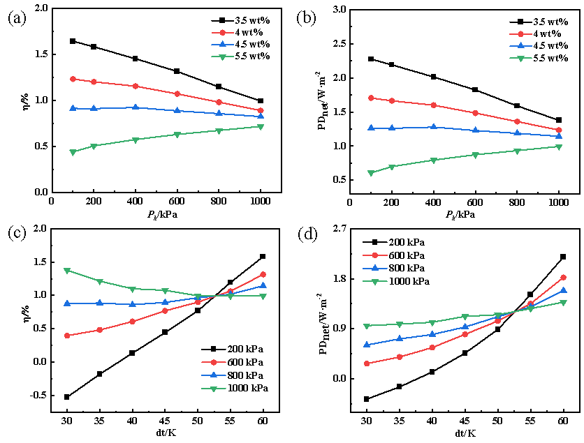图3. 水压和盐度对(a)能量转换效率和(b)净功率密度的影响。水压力和温差对(c)能量转换效率和(d)净功率密度的影响。