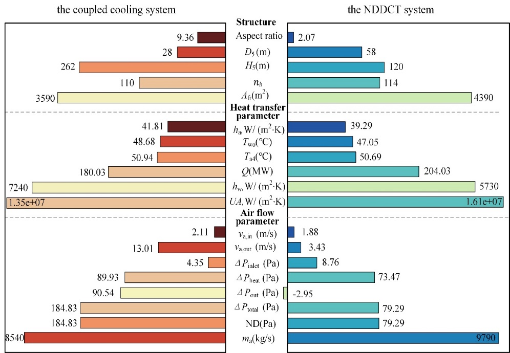 1. 该耦合冷却系统在262米塔高下可实现180.03 MW的排热量,与传统的120米高NDDCT性能相当,且末端温差极小。