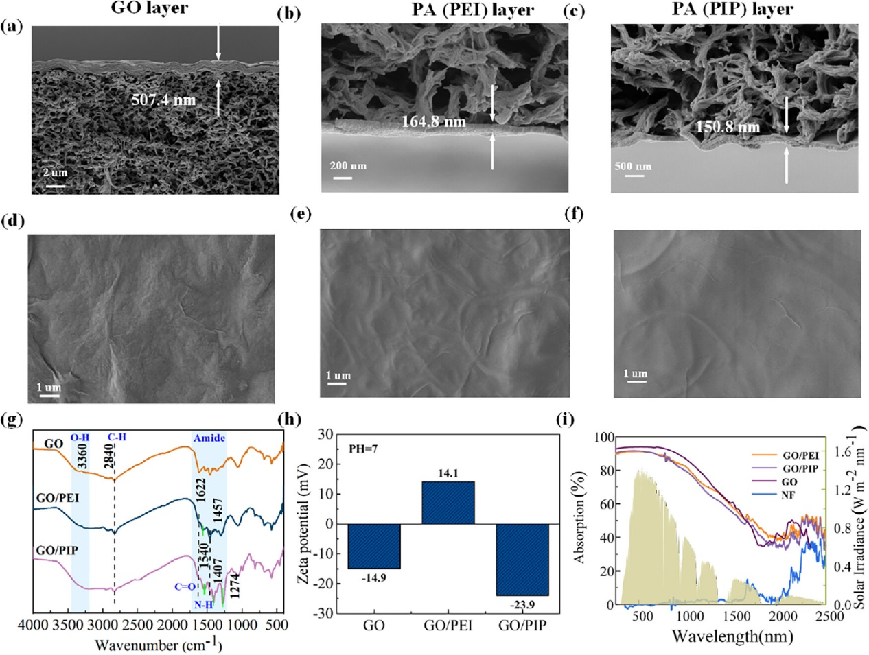 2. GO/PA膜的表征。(a−c) GOGO/PEIGO/PIP膜的截面SEM图像。(d−f) GOGO/PEIGO/PIP膜的表面形态SEM图像。(g) GO/PA膜的ATR-FTIR光谱。(h) 不同膜的ζ电位测量结果。(i) 350-2500 nm波长范围内的UV-Vis-NIR吸收光谱。