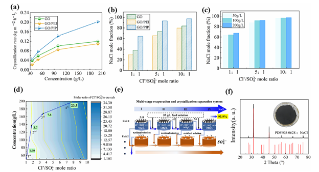 图4. GO/PA 膜的离子分离与结晶性能。(a) 不同膜在不同混合盐浓度(Cl⁻/SO₄²⁻ 摩尔比为 10:1)下的结晶速率变化。(b) 不同膜在不同摩尔比(盐浓度为 200 g/L)条件下蒸发后表面晶体中 NaCl 的摩尔分数。(c) GO/PIP 膜在不同盐浓度和摩尔比下经蒸发结晶后形成晶体中 NaCl 的摩尔分数。(d) 盐浓度与摩尔比对离子分离系数的影响。(e) 多级循环系统的示意图。(f) 蒸发实验后从膜表面收集的盐晶体的 XRD 图谱,黑色曲线表示实验测试结果。