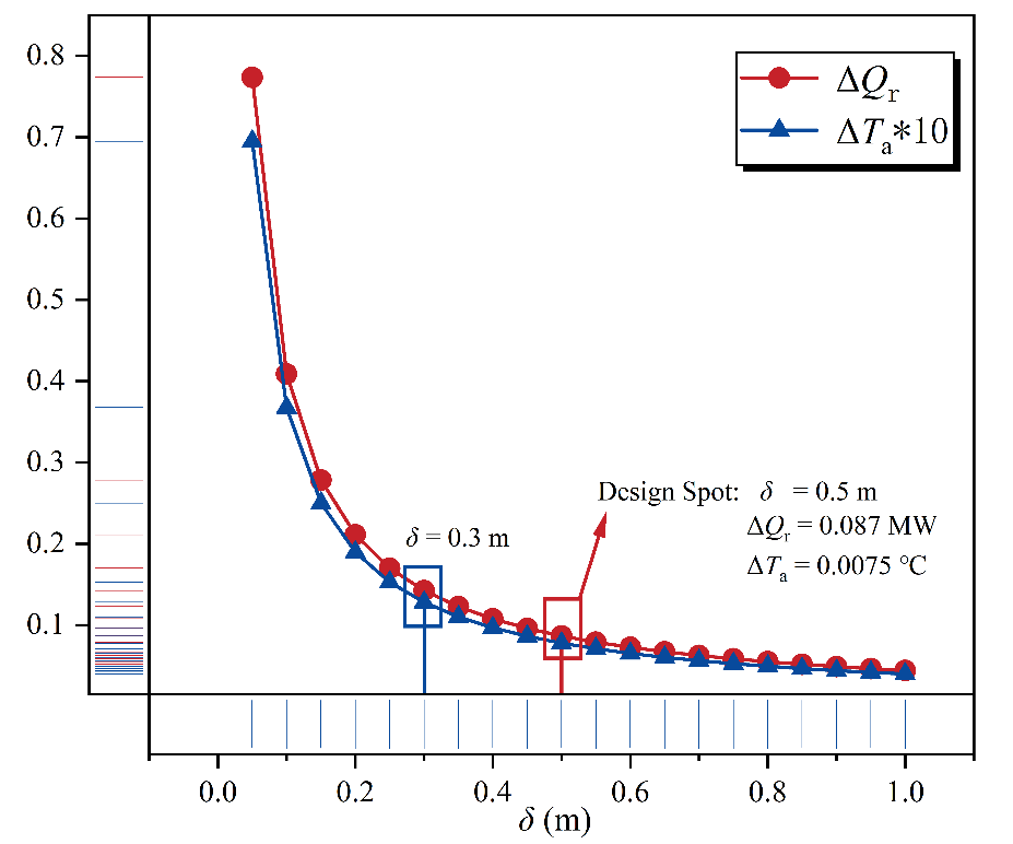 图3. 塔顶不同保温层厚度下的热损失与温升情况
