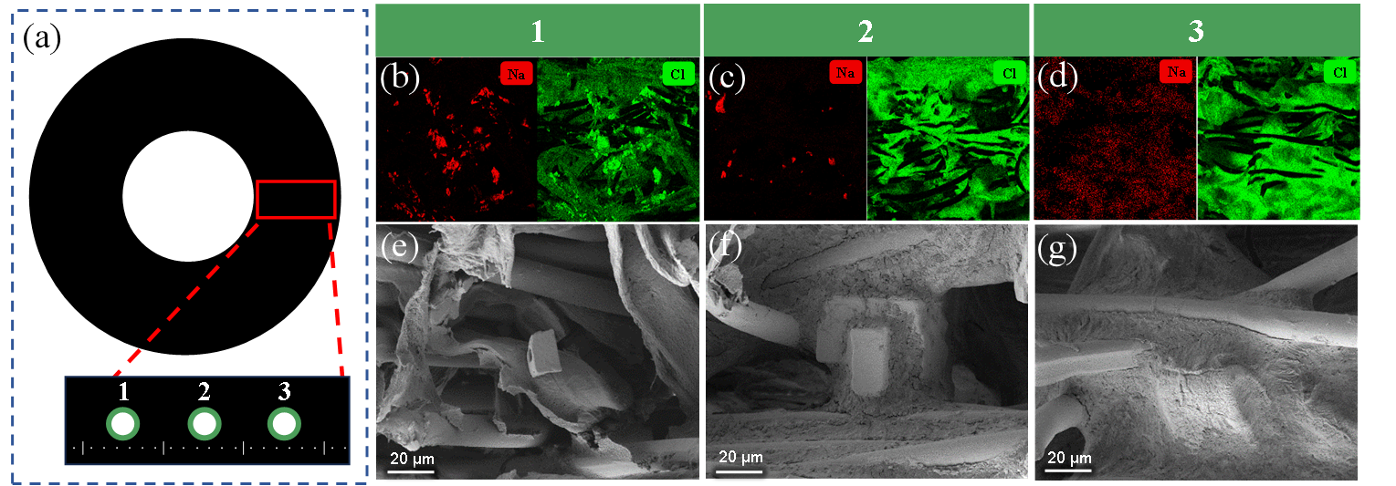图2. 光热膜上LiCl与NaCl自中心向边缘的径向分布。(a) 光热膜测试点选取示意图。(b-d) EDS能谱分析的Na、Cl元素分布图。(e-g) 光热膜SEM图像。