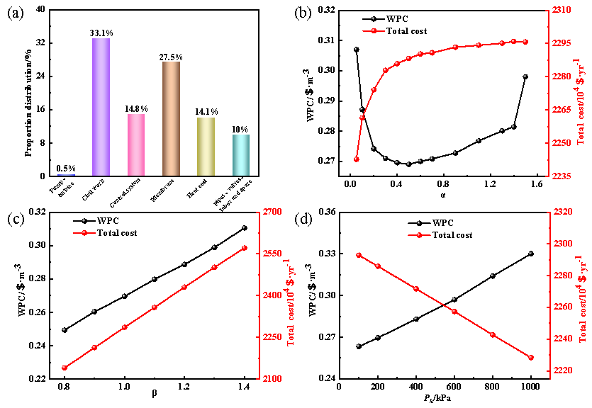 图6. 系统经济分析。(a)各组件成本分布。流量比(b)、膜面积比(c)和水力压力(d)对产水成本和总成本的影响。