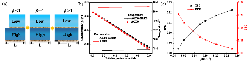 图4. (a)膜面积比形状。(b)AGTO热侧系统集成前后浓度和温度分布(0代表入口位置,1代表出口位置)和(c)流速对TPC和CPC的影响。